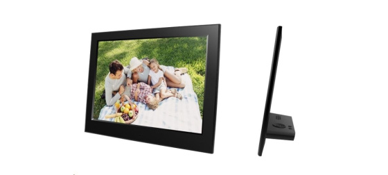 Digitální fotorámeček s úhlopříčkou 10", ultratenký 6,5 mm s opěrkou, vysoké rozlišení 1024x600px, 16:9, prohlížení obrázků ve formátu JPEG, poslech hudby MP3/WMA a přehrávání videa Full HD MPEG1/2/4, multislot SD/MS a USB2 flash max 32GB, Audio out, Auto Start/ON/OFF, funkce: SlideShow (prezentace), náhledy, zoom a otáčení obrázků, budík, hodiny, kalendář. Rozměr: 220x176x23 mm, hmotnost 440 g. Součástí dodávky síťový zdroj AC/DC 5V/1,5A, dálkové ovládání.