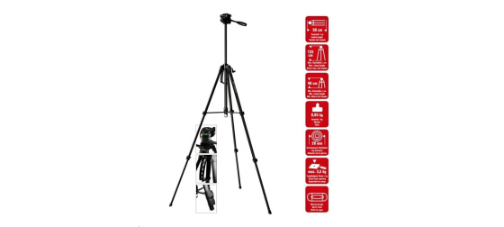 Lehký hliníkový foto/video stativ, 3-směrná hlava s výměnnou destičkou, vodováha, 3 segmenty noh se svorkami, profil 20mm, zatížení maximálně 3,5kg, rozměry: složený 50cm / výška 48-135cm, hmotnost 850g, barva černá, včetně pouzdra. Středový sloupek se vzpěrami pro vyšší stabilitu, nastavení výšky kličkou, háček na pověšení příslušenství nebo závaží, plastové ucho pro transport, nohy zakončené gumou..