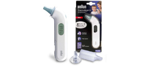 Teploměr, Typ teploměru: Do ucha/na čelo, Určení teploměru: Baby friendly, Počet paměťových míst: 9, Funkce paměti, Rychlost měření: 5 s, Zvuková signalizace, Typ baterie: AA", Hmotnost: 38 g..