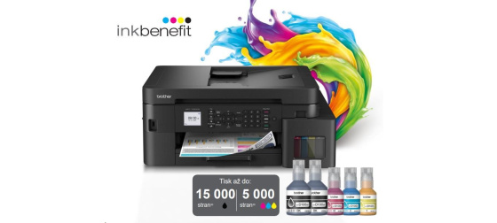 Kompaktní tiskárna vše v jednom MFC-T930DW tiskne déle s inkoustovými lahvičkami se super vysokou výtěžností, což snižuje náklady na barevnou stránku. Rychle naplňte nádržky během několika sekund, aniž byste museli držet lahvičky. Doplňování inkoustů je jednoduché a bez rizika jeho rozlití. Inovativní systém zámku lahviček zajišťuje, že vždy doplníte správnou barvu.