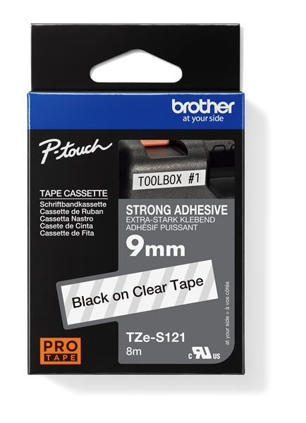 BROTHER TZES121 - kazeta TZ šířky 9mm, extrémně adhesivní lamino TZE-S121, průsvitná/černé písmo