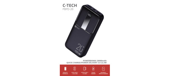 Popis C-TECH Powerbanka 20000mAh, Li-Pol, 22,5W, USB-C/USB-A/micro USB
