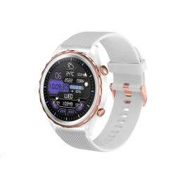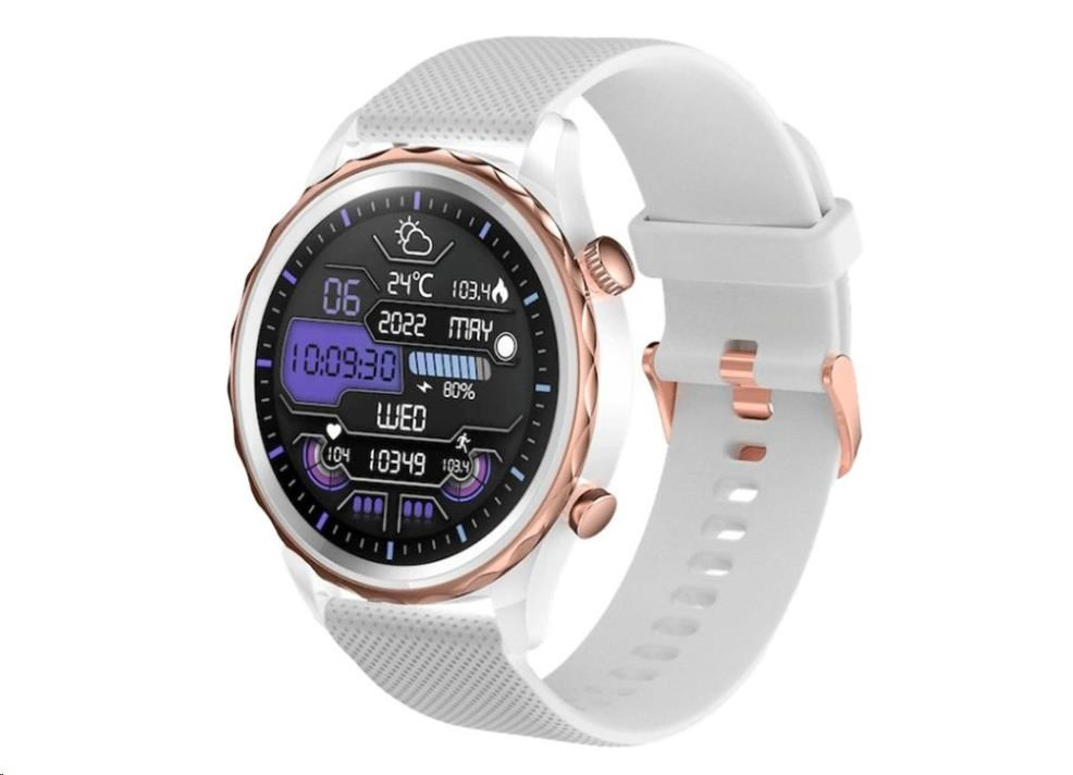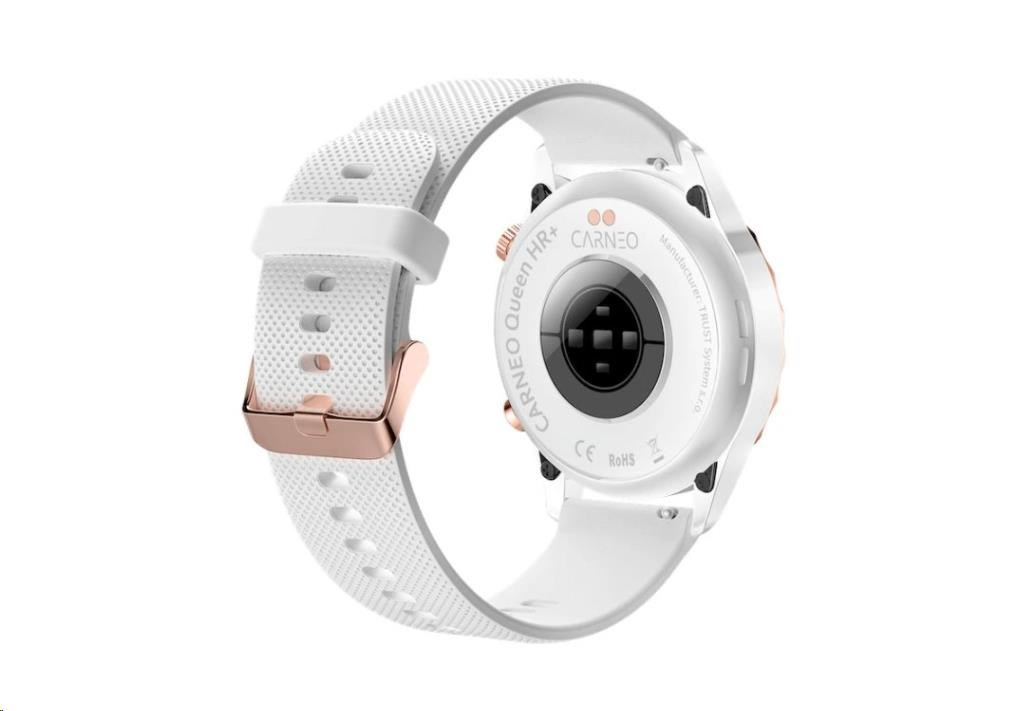 Moderní outdoorové fitness chytré hodinky Carneo Queen HR+ v elegantní bílé barvě se stříbrnou korunkou z nerezové oceli mají kulatý barevný displej SUPER AMOLED chráněný tvrdým minerálním sklíčkem. Umožňují měření srdečního tepu, stresu, BMI, ujeté vzdálenosti, monitorování spálených kalorií či kvality spánku. Obsahují 380mAh baterii s výdrží až 5 dní. Podle certifikace IP67 jsou odolné vůči vodě a prachu. Jsou kompatibilní s operačním systémem iOS a Android. Hodinky mají na dotek příjemný silikonový řemínek v černé barvě, který lze vyměnit za řemínek v jiné barvě či kožený nebo kovový a tím pádem změnit hodinkám sportovní vzhled za manažerský. Vkusný outdoorově-luxusní design se snadno kombinuje k obleku či volnočasovému outfitu. Hodinky i aplikace jsou kompletně v češtině, takže si budete jistě spolu dobře rozumět.