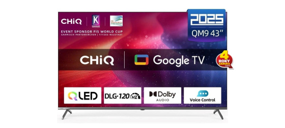 CHiQ U43QM9G, 43" (108 cm), QLED bezrámečková Smart Google TV 5.0, Ultra HD (4K), DLG 120 Hz, MEMC, Dolby Audio, dbx-tv, HDR 10, HLG, WiFi 2,4/5G, Bluetooth 5.0, webový prohlížeč, Google Assistant, Chromecast, O2 TV, YouTube, Netflix, Prime Video, paměť 2GB+16GB, 3x HDMI, 2x USB, CI slot, 20 W, energetická třída F.