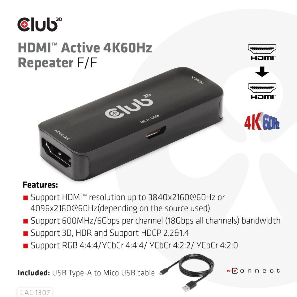 Club 3D CAC-1307 HDMI™ Active 4K60Hz Repeater prodlužuje délku jakéhokoli kabelu HDMI™ regenerací signálu HDMI™ před odesláním výstupů do monitoru nebo projektoru HDMI™. Aktivní opakovač HDMI™ odstraní digitální šum (jiskry) ve vašem obrazu. Vstup aktivního opakovače HDMI™ je připojen pomocí dlouhého kabelu HDMI™ (male to male) ze zařízení HDMI™, jako je DVD přehrávač nebo satelitní set top box s výstupním portem HDMI™. Výstup aktivního opakovače HDMI™ je připojen k druhému kabelu HDMI™ (male to male) pro přechod z výstupu na jakýkoli displej nebo projektor HDMI™ s konektorem HDMI™. Jednotka je umístěna co nejblíže k displeji (max. vzdálenost 5 m/16,4 stopy), aby se odstranil veškerý šum, který byl generován dlouhým kabelem HDMI™.