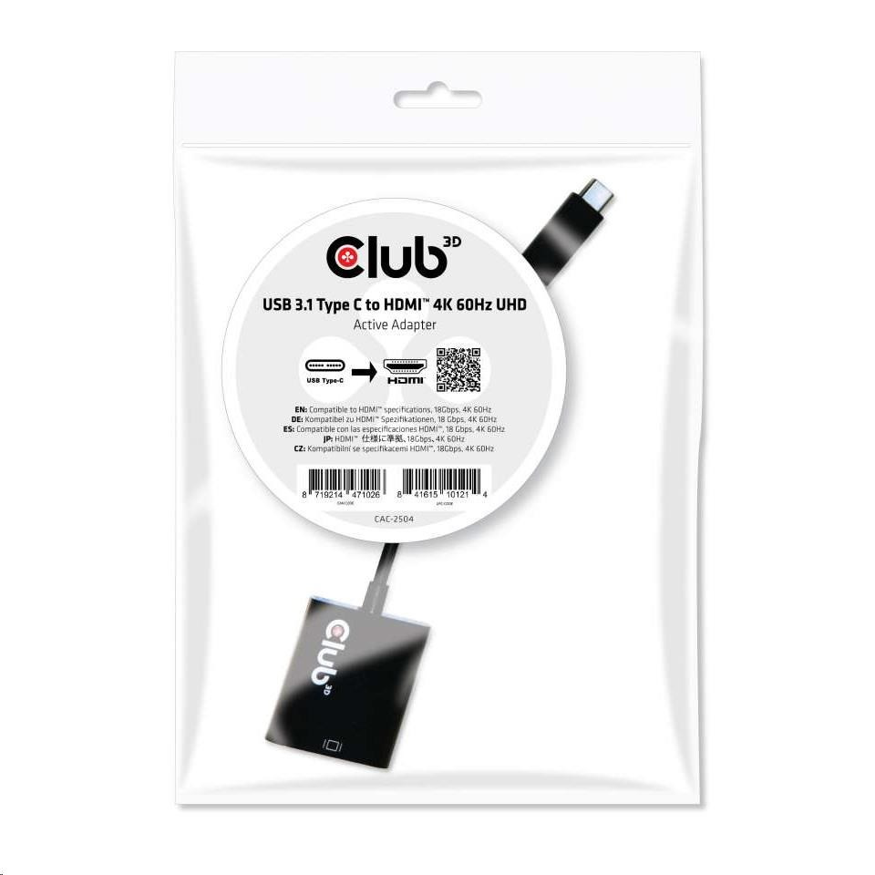 Club 3D CAC-2504 je aktivní převodník signálu HDMI ™. Adaptér USB 3.1 Type C na HDMI ™ 2.0 UHD 4K 60 Hz je nejjednodušším řešením pro připojení zdrojového zařízení, které obsahuje konektor USB 3.1 Type C s alternativním režimem DisplayPort ™ k (U)HD monitoru, televizoru nebo projektoru s rozhraním HDMI ™ 2.0. Adaptér je kompaktní a vysoce přenosný. Napájen portem USB-C, adaptér nevyžaduje žádné externí napájení a je ideální pro použití s notebooky a ultrabooky.