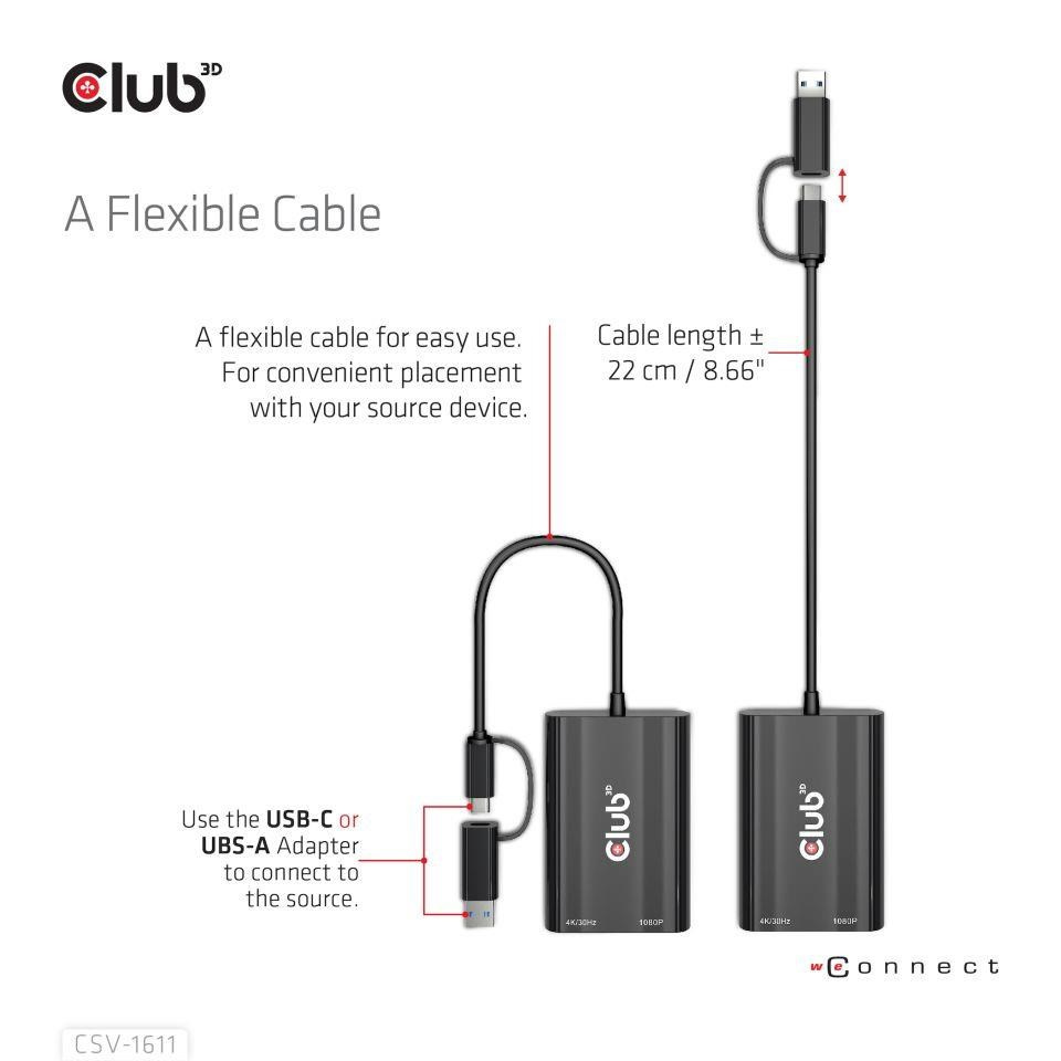 The Club 3D CSV-1611 USB Gen1 Type-C/-A to Dual HDMI™ (4K/30Hz) and VGA (1080/60Hz) adapter is a Dual Display adapter which provides most advanced, efficient solution to extend a single USB Type-C or Type-A port to HDMI™ and VGA displays. It supports single HDMI™ 4K/30Hz and VGA 1080P/60Hz or dual 4K/30Hz + VGA 1080P/60Hz simultaneous output of different videos. It can work on USB Mode and DP Alt mode supported Type-C and USB-A host. Dual Video output on MacBook with M1. Support USB Gen1 with max 5Gbps data transmission. The unit is powered thru the USB Type-A or Type-C host connection. No external power needed.