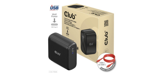 The Club3D CAC-1908 Travel Charger 100 Watt GAN technology, USB-IF TID certified, Single port USB Type-C, Power Delivery(PD) 3.0 Support is Compact in size & Superior in Performance: GAN technology chipset makes this charger 50% smaller than a traditional 100Watt Laptop chager, small enough to carry anywhere. Our CAC-1908 100Watt wall charger match a variety of PD devices from smart phones to laptops, one for all making charging simple. This wide compatibility charger will be your convenient companion during your business trip or vacation.