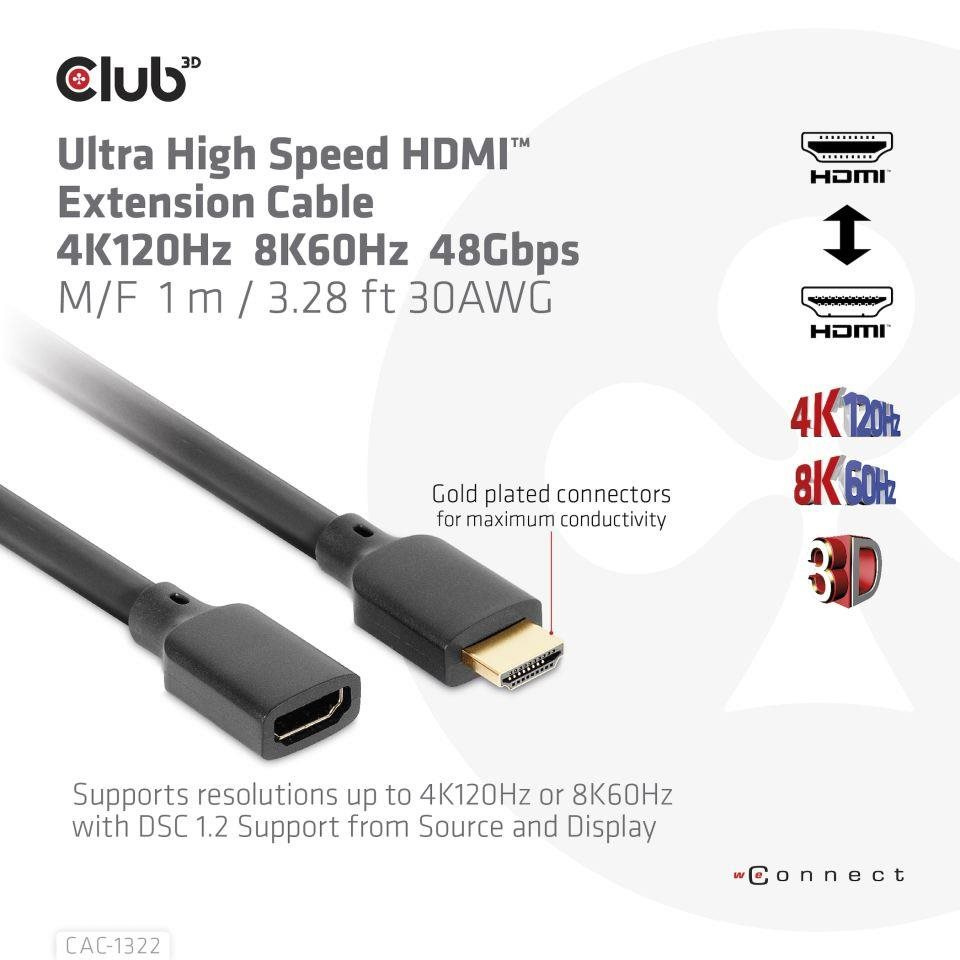 Popis Club3D prodlužovací Ultra rychlý HDMI kabel, 4K120Hz, 8K60Hz, 48Gbps, M/F, 1m, 30 AWG