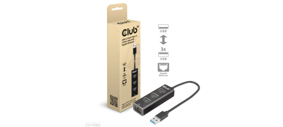 Club 3D CSV-1430a je rozbočovač USB 3.2 Gen1 Type-A se 3 porty s gigabitovým Ethernetem a je navržen stylovým způsobem a velmi tenký, takže se snadno přenáší. CSV-1430a vám umožňuje současný přístup k 3 portům USB 3.2 Gen1 Type-A a portu Ethernet 10/100/1000 z jediného up-linku USB 3.2 Gen1 Type-A. Zařízení je zpětně kompatibilní se standardem USB 2.0, ale to bude mít vliv na výkon. Všechny 3 porty USB jsou kompatibilní s USB Type-A a USB 3.2 Gen1 s přenosem dat max. 5 Gb/s. Ethernetový port je kompatibilní s Gigabit Ethernet 10/100/1000 (RJ45) a plně duplexní s řízením toku.