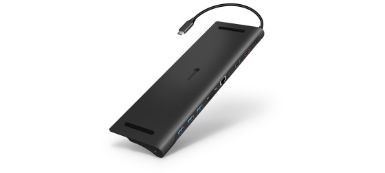 Prakticky tvarovaná USB-C dokovací stanice "Multi11in1" pro připojení až 11 periferií (2x USB-C, 2x HDMI, 3x USB-A, 3.5 mm jack, RJ45 Gigabit Ethernet. SD karta, MicroSD karta).