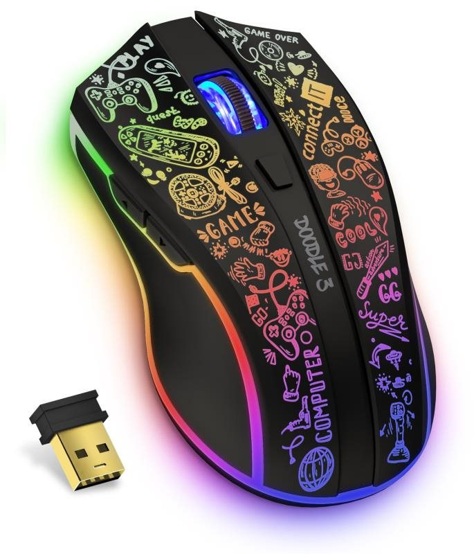 Profesionální bezdrátová gamingová myš DOODLE 3 pro hráče počítačových her s Rainbow podsvícením. Dodávaný SW s četnými nastaveními podporuje uživatelská makra, 5 uživatelských profilů a 6 programovatelných tlačítek včetně posuvného kolečka. Precizní optický senzor má nastavitelnou citlivost až na 4800 DPI. Myš využívá technologie jako povrchový RubberGrip pro eliminaci klouzavosti dlaně, UltraSlides Black pojezdy pro maximální možnou rychlost na podložce. Nechybí ani technologie AutoPowerSave šetřící kapacitu baterie. Software je zdarma ke stažení na stránkách www.connectit-europe.com. Samožřejmostí je pozlacený USB Nano přijímač a dodávaný nabíjecí kabel.
