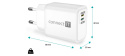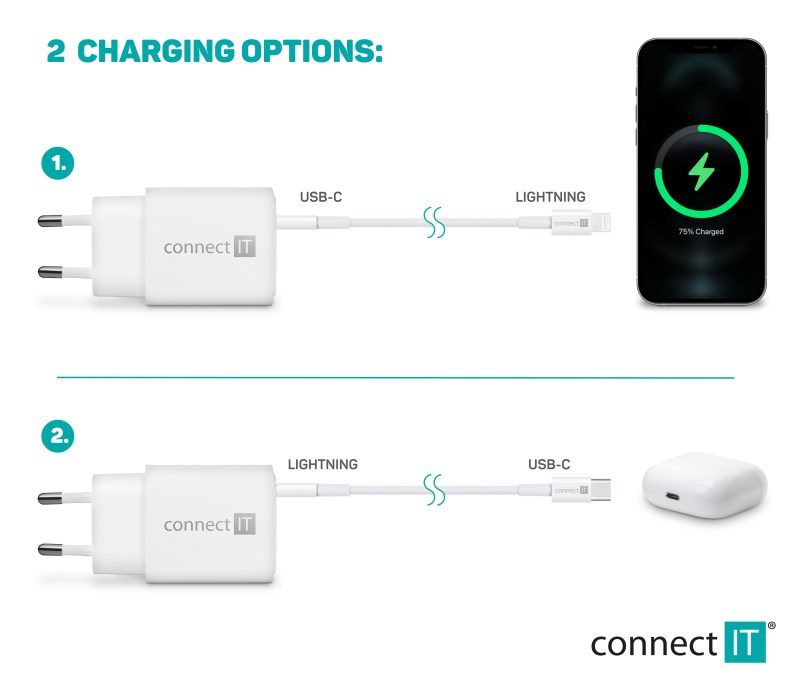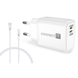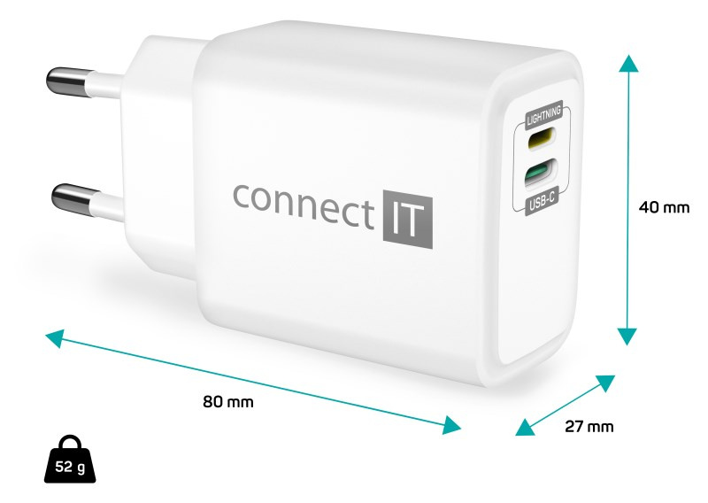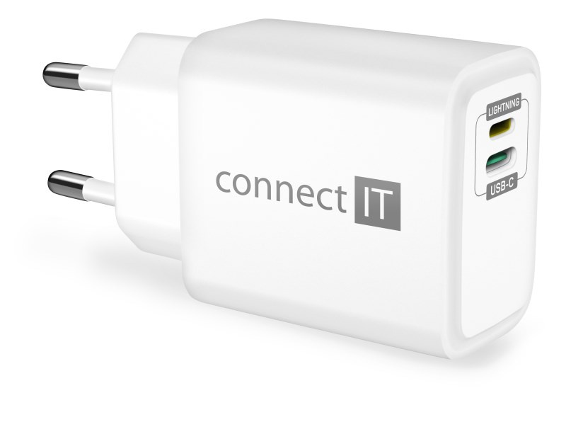 Unikátní cestovní nabíječka CONNECT IT "Duplex" disponuje dvěma porty - Lightning a USB-C. Díky této ojedinělé technologii lze nabíjet zařízení jak s Lightning vstupem, tak USB-C vstupem jedním univerzálním kabelem. Nabíječka je určená pro napájení i nabíjení mobilních telefonů, tabletů, power bank, akčních kamer, elektronických čteček knih, MP3 a MP4 přehrávačů, herních konzolí a mnoha dalších přenosných zařízení doma, v kanceláři i na cestách. Technologie Power Delivery (PD) umožňuje rychlonabíjení o výkonu 20 W. Součástí balení je i velice kvalitní kabel Lightning -> USB-C, který dokáže přenést až 27 W.