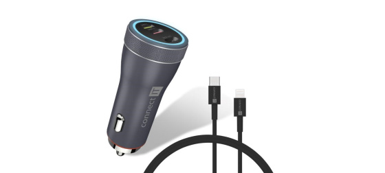 Unikátní tříportová nabíječka do auta CONNECT IT "Duplex" s kombinací výstupů USB-C a Lightning s kombinovaným výkonem 55 W.