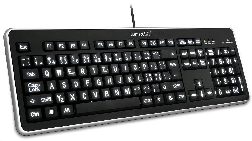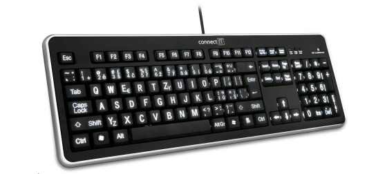 Novou LED podsvícenou klávesnici CONNECT IT s velkým fontem ocení nejen uživatelé s horším zrakem, ale i každý, kdo pracuje v šeru a vecerních hodinách. Cerný povrch se stríbrným lemováním dodává klávesnici elegantní vzhled. Vlastnosti: - české rozložení kláves - velký font kláves pro pohodlné psaní - bílé podsvícení pomocí LED diod pro použití v šeru a tmě - tlačítko pro vypnutí podsvícení - matný povrch klávesnice - kompatibilní s USB 1.1 a 2.0 - délka kabelu: 140 cm. Connect IT, Poděbradská 309/55 190 00 Praha 9 Česká republika, info@connectit.cz