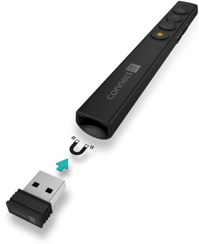 | Funkce prezentéru | - TAB/ENTER/ALT+TAB - PAGE UP/FULL SCREEN - PAGE DOWN/BLACK SCREEN - VOLUME UP/PLAY/PAUSE - VOLUME DOWN/NEXT/PREVIOUS |