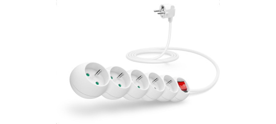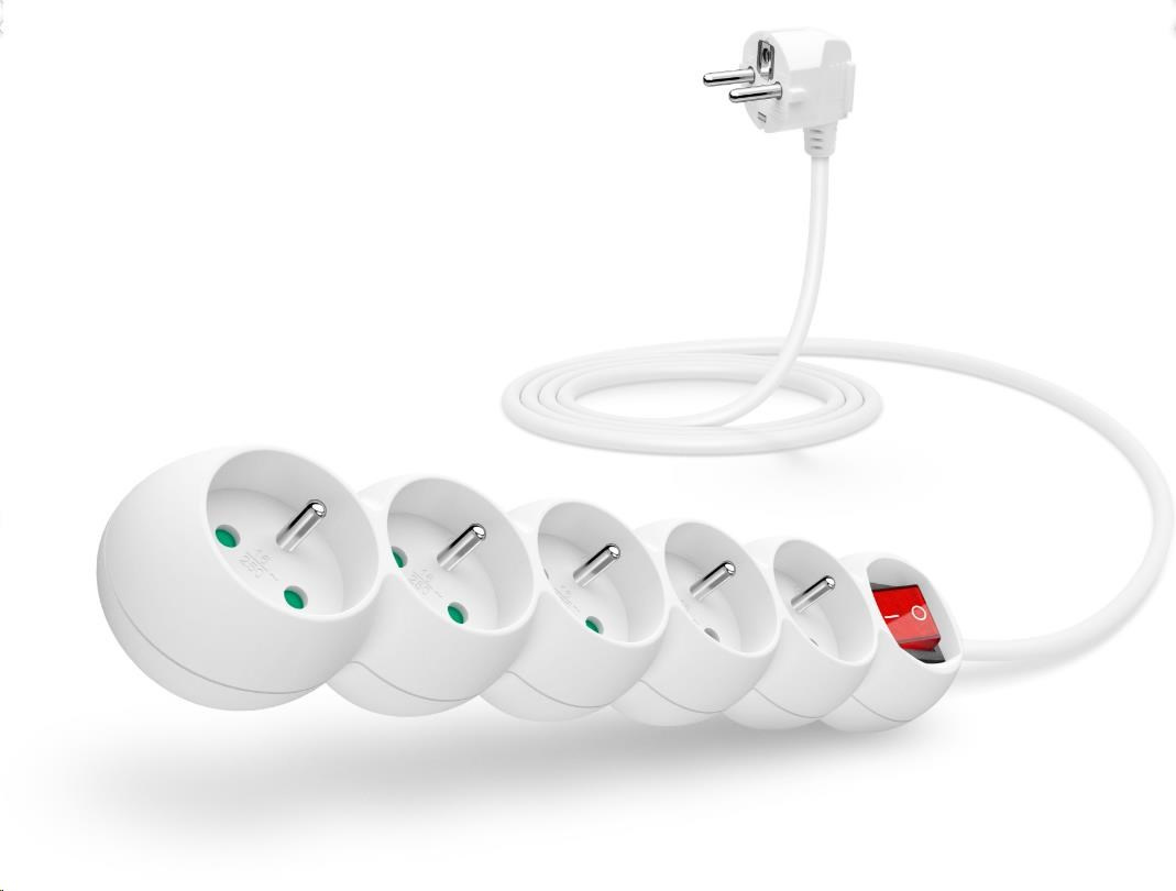 Prodlužovací kabelový přívod na 230V je vybaven hlavním síťovým vypínačem, který při vypnutí zcela odpojí od přívodu elektrické energie všechny zapojené spotřebiče najednou. Extra výbavou je dětská ochrana všech zásuvek – zásuvky jsou přístupné pouze v případě zasunutí obou vidlic najednou, nelze tedy zasunout jednotlivě např. pouze šroubovák nebo pletací jehlici.