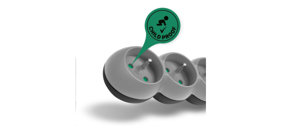 - Dětská ochrana všech zásuvek (zásuvky jsou přístupné pouze v případě zasunutí obou vidlic najednou, nelze tedy zasunout jednotlivě např.