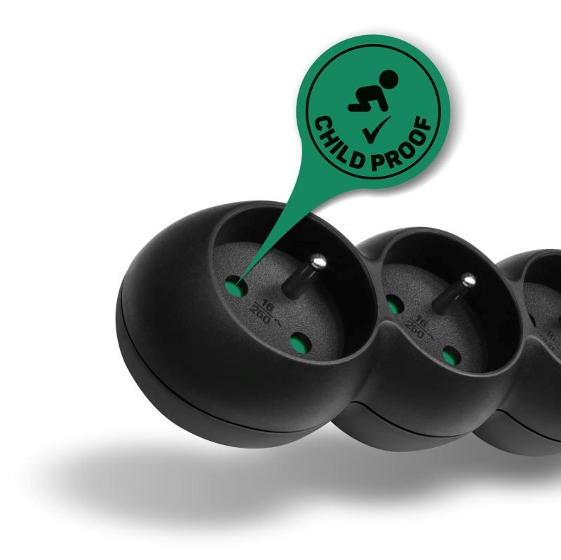 Prodlužovací kabelový přívod na 230V je vybaven hlavním síťovým vypínačem, který při vypnutí zcela odpojí od přívodu elektrické energie všechny zapojené spotřebiče najednou. Extra výbavou je dětská ochrana všech zásuvek – zásuvky jsou přístupné pouze v případě zasunutí obou vidlic najednou, nelze tedy zasunout jednotlivě např. pouze šroubovák nebo pletací jehlici. Díky pootočení zásuvek o 45° je možné používat i objemnější napájecí adaptéry nebo úhlové koncovky. Výsuvné očko v horní části zásuvkového modulu umožňuje zavěšení nebo pevnou instalaci na stěnu (s výhodou využijete např. v dílnách a garážích). Výrobek byl testován a certifikován v evropském testovacím centru a splňuje nejpřísnější bezpečnostní požadavky a nejnovější normy, takže umožňuje zapojení spotřebičů o celkovém příkonu až 2300 W.