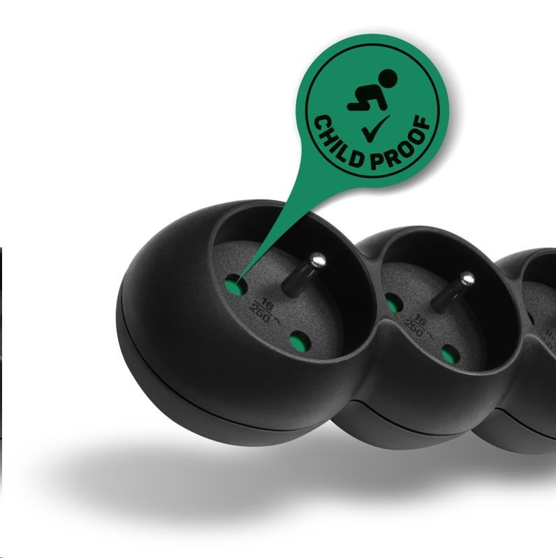 Dětská ochrana všech zásuvek (zásuvky jsou přístupné pouze v případě zasunutí obou vidlic najednou, nelze tedy zasunout jednotlivě např. pouze šroubovák nebo pletací jehlici)
