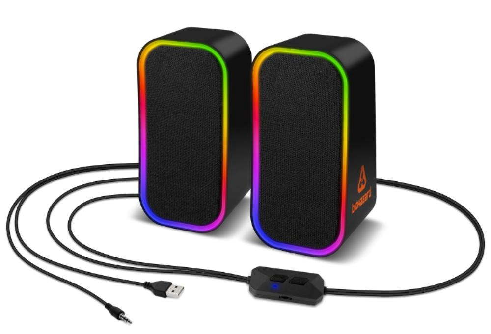 Gamingové reproduktory BIOHAZARD pro hráče počítačových her s připojením pomocí bluetooth nebo AUX vstupem.