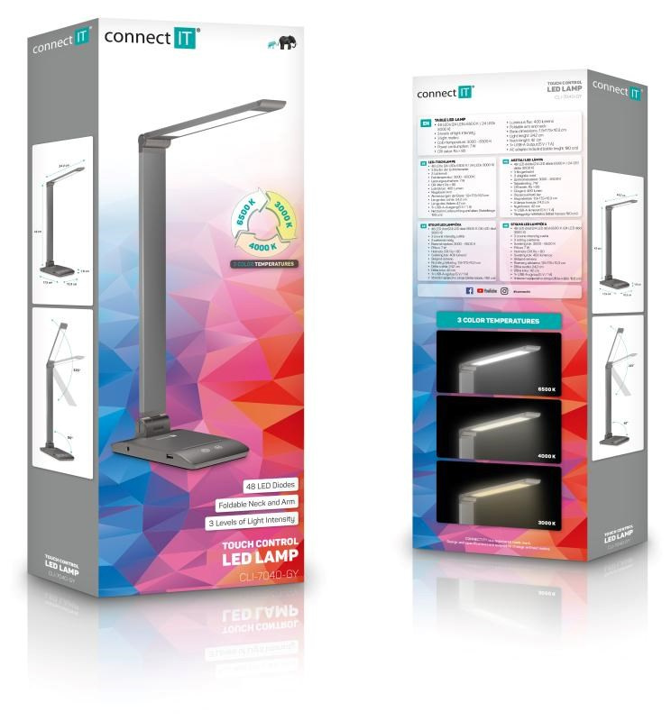 Díky sklopnému rameni a krku nastavíte dokonalý úhel pro jakoukoliv práci. Lampička disponuje USB-A výstupem s výkonem 5 W a dvěma praktickými dotykovými spínači, které umožňují zapnout/vypnout lampu, nastavit 3 úrovně jasu světla nebo nastavit barevnou teplotu světla ve 3 různých úrovních (3000/4000/6500 K).