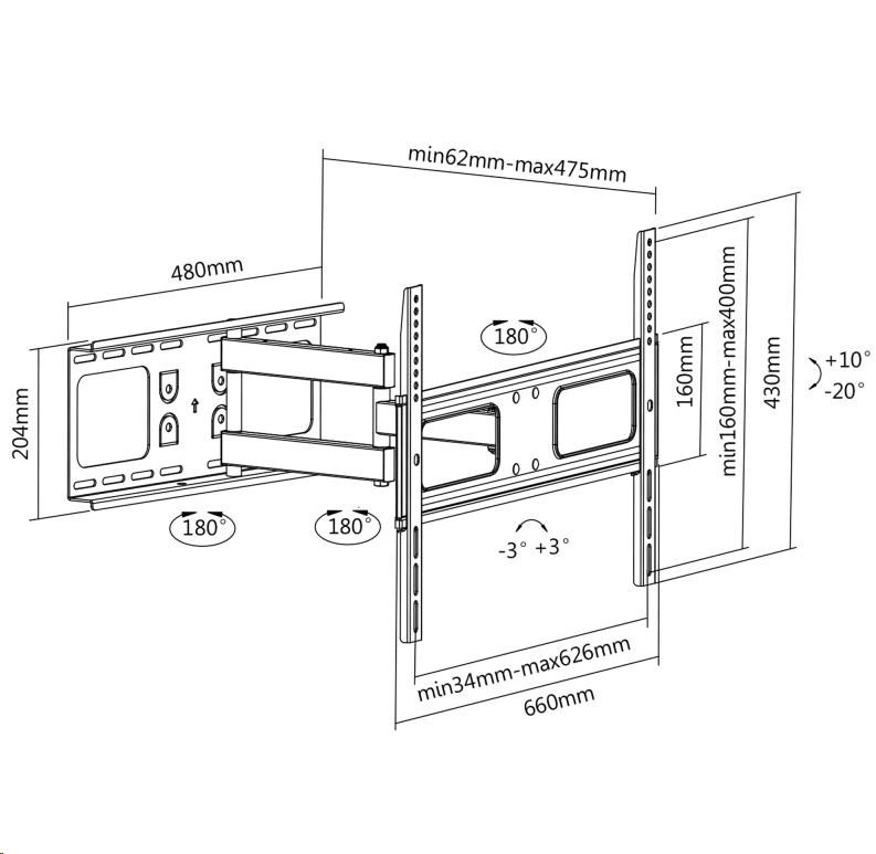 - Rozměry držáku (š x v x h): 660 x 430 x 62~475 mm
