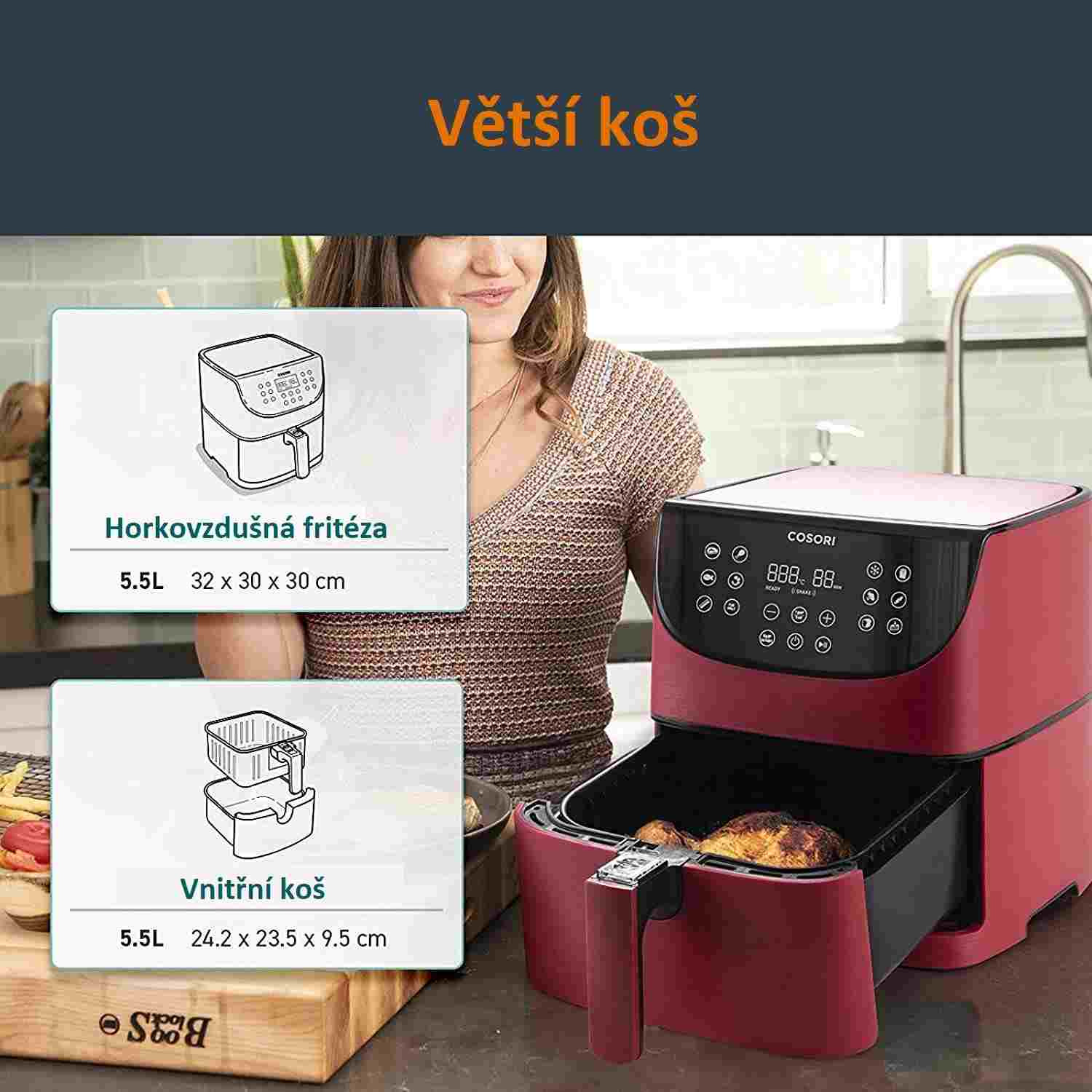 S horkovzdušnou fritézou COSORI CP158-AF PREMIUM si můžete užít vaše oblíbená smažená jídla bez výčitek, protože na rozdíl od běžného smažení nebo fritování je možné v ní připravovat jídla za použití velice malého množství oleje a nebo vůbec žádného. Kombinace cirkulujícího horkého vzduchu, dokonalé teploty vaření a chytrých programů zajistí, že hranolky budou vždy krásně křupavé a kuřecí stehna šťavnatá. Ať už je vaše jídlo čerstvé nebo mražené, stisknutím tlačítka můžete horkým vzduchem smažit kuřecí křídla, kuřecí prsa, sladké brambory, steaky, čerstvé hranolky a mnoho dalšího. Až budete mít hotovo, čištění bude stejně snadné díky nepřilnavému koši, který lze mýt v myčce. Díky veliké nádobě s objemem 5,5l navíc dokážete rychle navařit i pro větší rodinu nebo skupinu hostů.