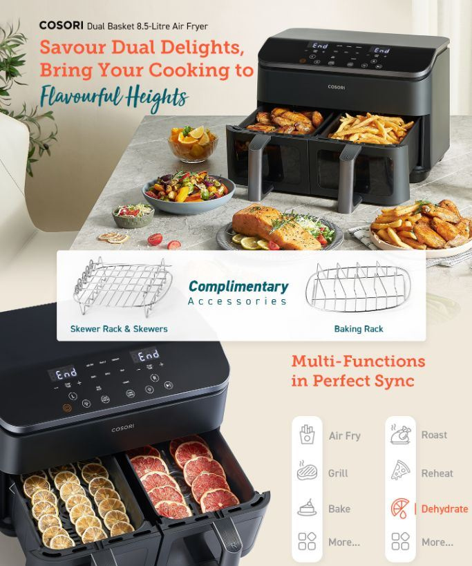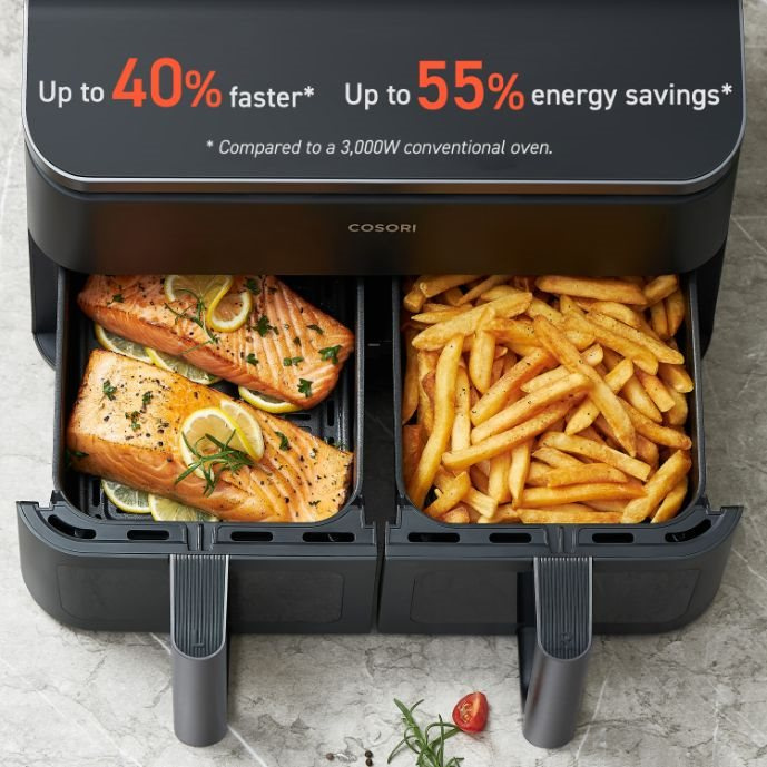 Cosori CAF-R901-AEU Dual Basket je ideální volbou pro ty, kteří hledají multifunkční horkovzdušnou fritézu s možností současné přípravy různých pokrmů. Díky širokému teplotnímu rozsahu, přednastaveným programům a praktickým funkcím jako Sync Cook a Sync Finish nabízí pohodlné a zdravé vaření pro celou rodinu.