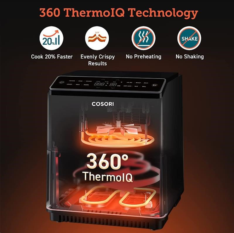 S horkovzdušnou fritézou COSORI CAF-P583S SMART si můžete užít vaše oblíbená smažená jídla bez výčitek, protože na rozdíl od běžného smažení nebo fritování je v této horkovzdušné fritéze možné připravovat jídla za použití velice malého množství oleje nebo vůbec žádného. Patentovaná technologie THERMO IQ 360° HEAT CIRCULATION přesně reguluje teplotu inteligentním teplotním algoritmem a zajišťuje tak rovnoměrně uvařené jídlo bez nutnosti jeho protřepání nebo překlápění. Kombinace cirkulujícího horkého vzduchu, dokonalé teploty vaření a chytrých programů zajistí, že hranolky budou vždy krásně křupavé a kuřecí stehna šťavnatá. Programy si můžete rychle a pohodlně nastavit také přes smartphone nebo Amazon Alexa a Google Assistant. Až budete mít hotovo, čištění bude stejně snadné díky nepřilnavému koši, který lze mýt v myčce. Díky veliké nádobě s objemem 6,4l navíc dokážete rychle navařit i pro větší rodinu nebo skupinu hostů.