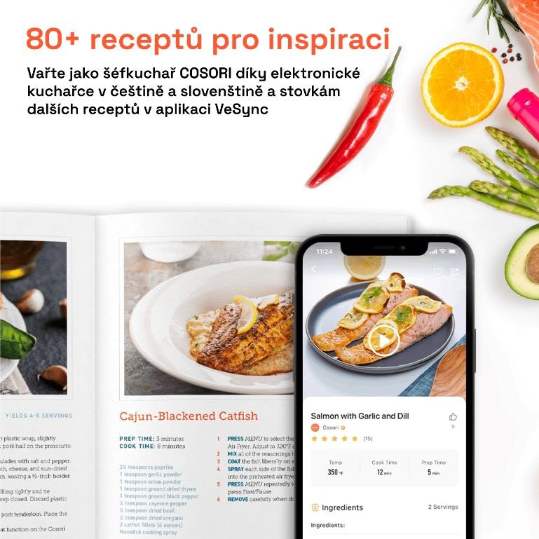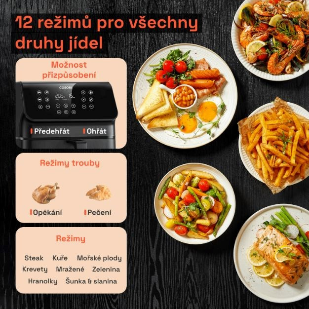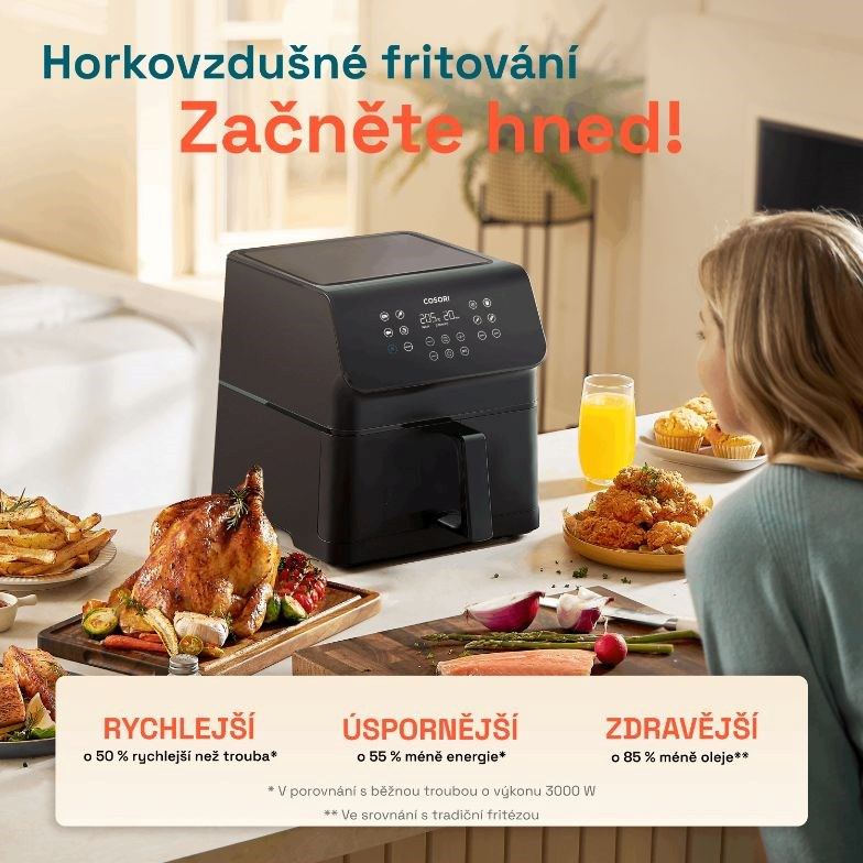 Představujeme horkovzdušnou fritézu Cosori Premium II. Inovované řešení, které nejen šetří čas, ale také energii a nabízí způsob vaření, který je šetrný ke zdraví. S horkovzdušnou fritézou si můžete užívat oblíbená jídla připravovaná s minimem oleje, vyhnete se zápachu ze smažení a také úklid je díky možnosti mýt koš v myčce hračkou. Fritéza nabídne koš se štědrým objemem 6,2 litrů, takže v ní je možné pohodlně připravit jídlo pro 3-5 lidí, například celé, 2,3 kg kuře. Při vysoké objemu si ale zachová malé vnější rozměry, takže se hodí i do malých kuchyní. S technologií 360° cirkulujícího vzduchu se fritéza zahřeje na provozní teplotu do 5 minut a dále výrazně zkracuje dobu vaření. Malý objem také znamená malou spotřebu energie ve srovnání s běžnou troubou. Fritéza nabídne 12 programů pro přípravu pokrmů, které je možné upravit podle individuálních chutí. Displej fritézy je přehledný a pohodlně nakloněný pro perfektní čitelnost. V dnešní digitální době je také poměrně atraktivní funkce vypnutí zvuku tlačítek. Jako bonus si můžete stáhnout e-kuchařku s 80 recepty v češtině i slovenštině a v balení najdete 50 ks papírových pečících forem.
