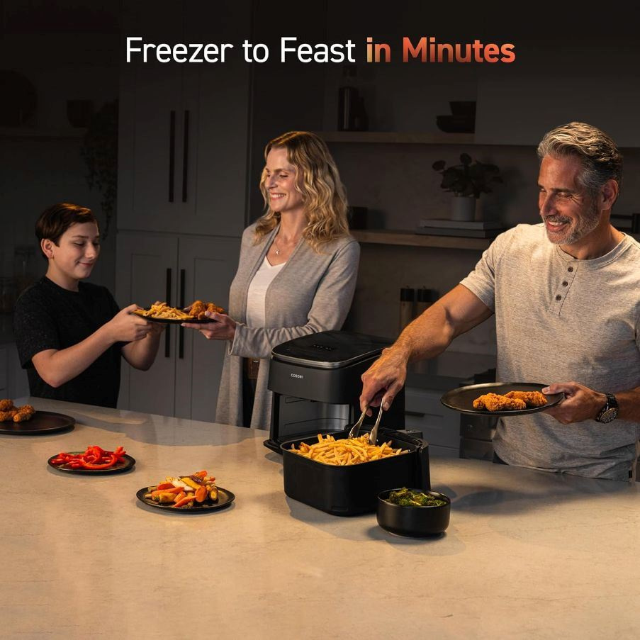 Cosori TurboBlaze Pro využívá stejnosměrný (DC) motor, který zkracuje dobu vaření až o 46 % oproti běžným fritézám s AC motory¹⁴. Díky 9 přednastaveným režimům (fritování, pečení, grilování, dušení, sušení, rozmrazování, ohřívání, udržování teploty aj.)² a 5 úrovním proudění vzduchu (1 000 – 3 600 ot./min)¹⁴ dosáhnete rovnoměrného propečení bez nutnosti ručního míchání. Velký 6,2 l koš pojme až 1,1 kg potravin⁷ a jeho keramický nepřilnavý povrch je odolný a snadno omyvatelný v myčce⁷. Silný topný článek o výkonu 1 725 W a teplotním rozsahu 30 – 230 °C³ zaručuje rychlé a přesné vaření i náročných pokrmů.