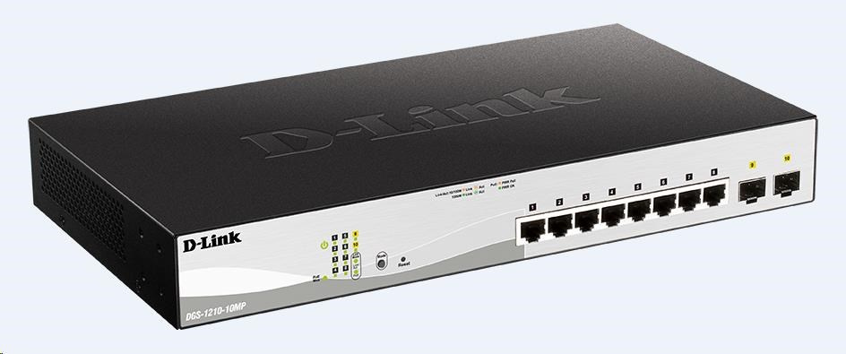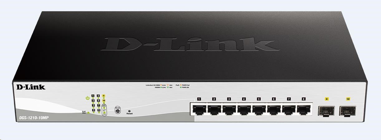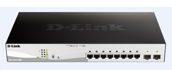 Popis D-Link DGS-1210-10MP 10-port Gigabit Smart+ PoE Switch, 8x GbE PoE+, 2x SFP, PoE 130W, fanless