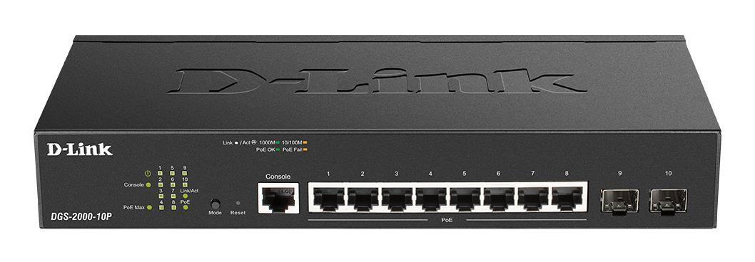D-Link DGS-2000-10P je plně řízený 10-portový Gigabit Managed PoE switch pro kanceláře a podnikové sítě. Přepínač je osazen 8 porty 10/100/1000M RJ-45 s podporou napájení 802.3at PoE+ (max. 30W na port) a dvěma dvourychlostními 100/1000M SFP porty pro optický uplink. Celkový PoE výkon přepínače je 65W. Provedení bez ventilátorů zajišťuje tichý chod a umožňuje nasazení přímo v kanceláři, součástí dodávky jsou také držáky pro montáž do 19“ rozvaděče. Switche D-Link řady DGS-2000 nabízí komplexní sadu L2 funkcí, bezpečnostní funkce, funkce kvality služeb (QoS) a základní L3 funkce (max. 4 IP Interfaces, statický routing s max. 128 IPv4/IPv6 záznamy, default route, IPv6 Neighbor Discovery). Řešení případných potíží v sítí usnadňují funkce 802.3ah OAM, diagnostika kabelů a detekce jednosměrné linky (D-Link Unidirectional Link Detection, DULD). ISP poskytovatelé internetu ocení funkce Q-in-Q (Port Based), Multicast VLAN (ISM VLAN) nebo IGMP Authentication / Filtering pro efektivní provoz IPTV služeb. Správa přepínače je přes webové rozhraní, CLI sériovou konzoli, Telnet, SLL, SSH nebo pomocí SNMP příkazů. Pro prvotní konfiguraci a základní správu je k dispozici bezplatný SW nástroj a mobilní aplikace D-Link Network Assistant (DNA), pro centrální správu rozsáhlejších sítí je určena pokročilá platforma D-View 7..