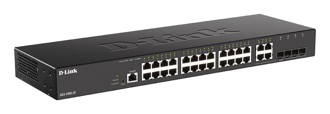 D-Link DGS-2000-28 je plně řízený 28-portový Gigabit Managed switch pro kanceláře a podnikové sítě. Přepínač je osazen 24 porty 10/100/1000M RJ-45 a čtyřmi kombinovanými Gigabit Combo porty RJ-45/SFP, s podporou 100M a 1000M SFP (Mini-GBIC) transceiverů pro optický uplink. Provedení bez ventilátorů zajišťuje tichý chod a umožňuje nasazení přímo v kanceláři, součástí dodávky jsou také držáky pro montáž do 19“ rozvaděče. Switche D-Link řady DGS-2000 nabízí komplexní sadu L2 funkcí, bezpečnostní funkce, funkce kvality služeb (QoS) a základní L3 funkce (max. 4 IP Interfaces, statický routing s max. 128 IPv4/IPv6 záznamy, default route, IPv6 Neighbor Discovery). Řešení případných potíží v sítí usnadňují funkce 802.3ah OAM, diagnostika kabelů a detekce jednosměrné linky (D-Link Unidirectional Link Detection, DULD). ISP poskytovatelé internetu ocení funkce Q-in-Q (Port Based), Multicast VLAN (ISM VLAN) nebo IGMP Authentication / Filtering pro efektivní provoz IPTV služeb. Správa přepínače je přes webové rozhraní, CLI sériovou konzoli, Telnet, SLL, SSH nebo pomocí SNMP příkazů. Pro prvotní konfiguraci a základní správu je k dispozici bezplatný SW nástroj a mobilní aplikace D-Link Network Assistant (DNA), pro centrální správu rozsáhlejších sítí je určena pokročilá platforma D-View 7..