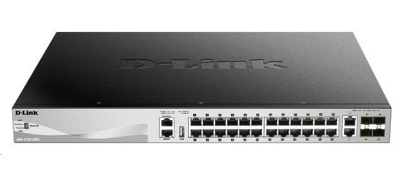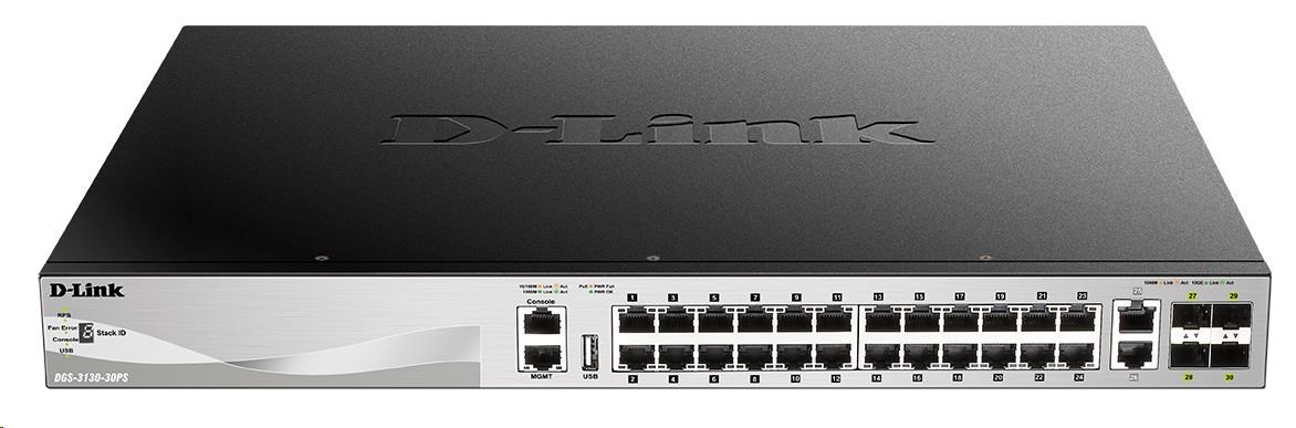 Popis D-Link DGS-3130-30PS/E L3 Stackable Managed Gigabit PoE Switch, 24x PoE gigabit, 2x 10GBASE-T, 4x SFP+, 370W PoE