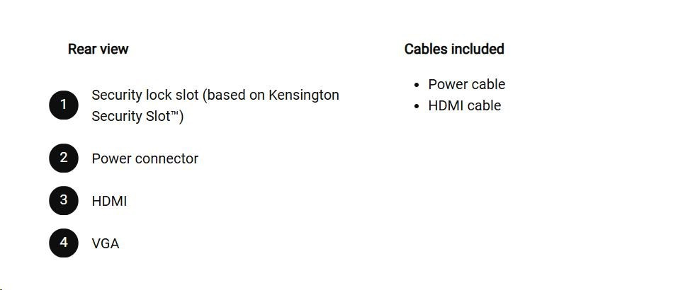 | 1. | Video port - 1 HDMI port (HDCP 1.4) (Supports up to FHD 1920 x 1080, 100 Hz)