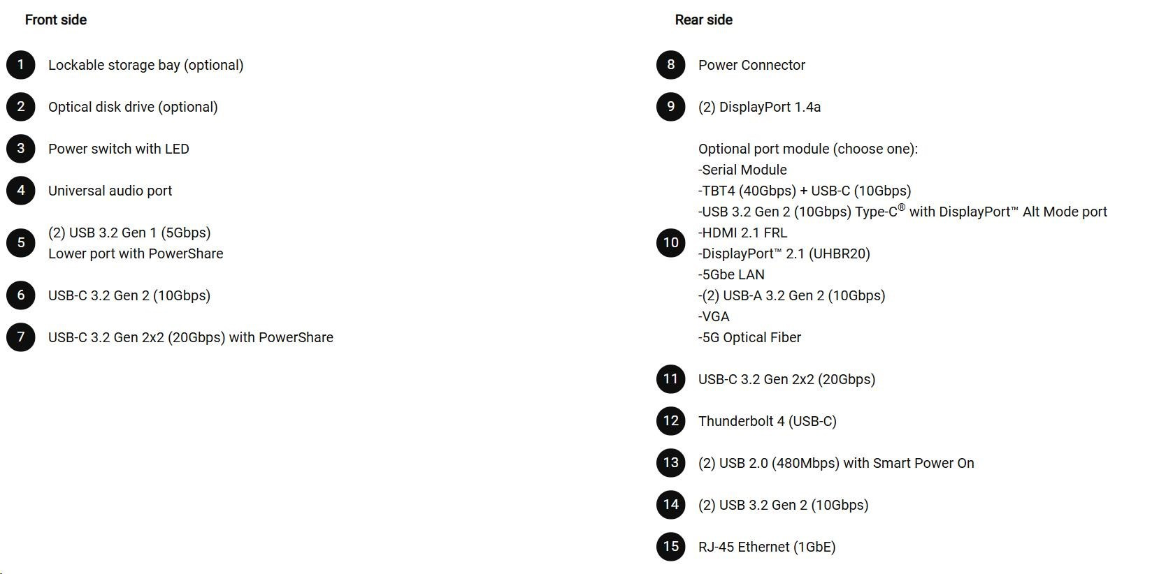 -Serial Module -TBT4 (40Gbps) + USB-C (10Gbps) -USB 3.2 Gen 2 (10Gbps) Type-C® with DisplayPort™ Alt Mode port -HDMI 2.1 FRL -DisplayPort™ 2.1 (UHBR20) -5Gbe LAN -(2) USB-A 3.2 Gen 2 (10Gbps) -VGA -5G Optical Fiber - USB-C 3.2 Gen 2x2 (20Gbps)