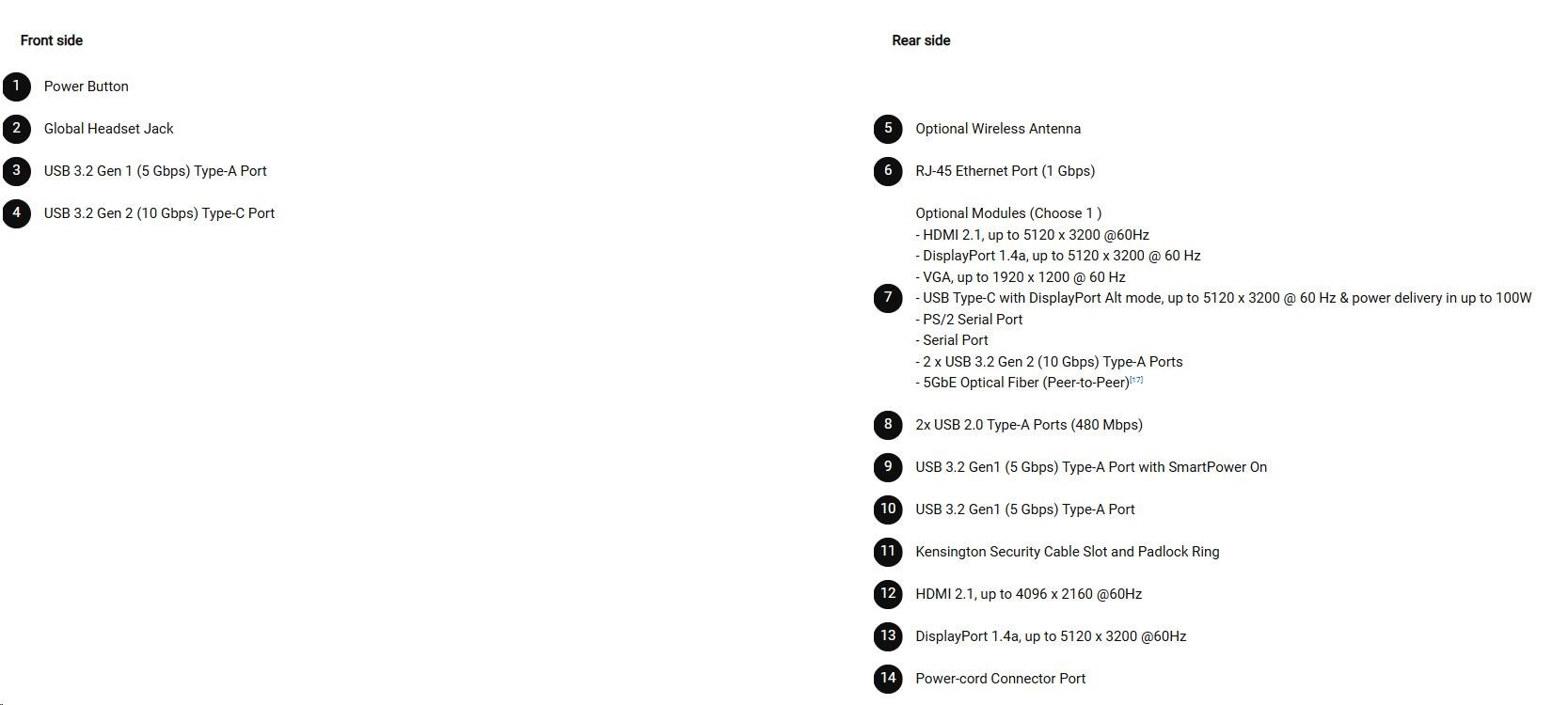 Optional Modules (Choose 1 ) - HDMI 2.1, up to 5120 x 3200 @60Hz - DisplayPort 1.4a, up to 5120 x 3200 @ 60 Hz - VGA, up to 1920 x 1200 @ 60 Hz - USB Type-C with DisplayPort Alt mode, up to 5120 x 3200 @ 60 Hz & power delivery in up to 100W - PS/2 Serial Port - Serial Port - 2 x USB 3.2 Gen 2 (10 Gbps) Type-A Ports - 5GbE Optical Fiber (Peer-to-Peer) - 2x USB 2.0 Type-A Ports (480 Mbps)