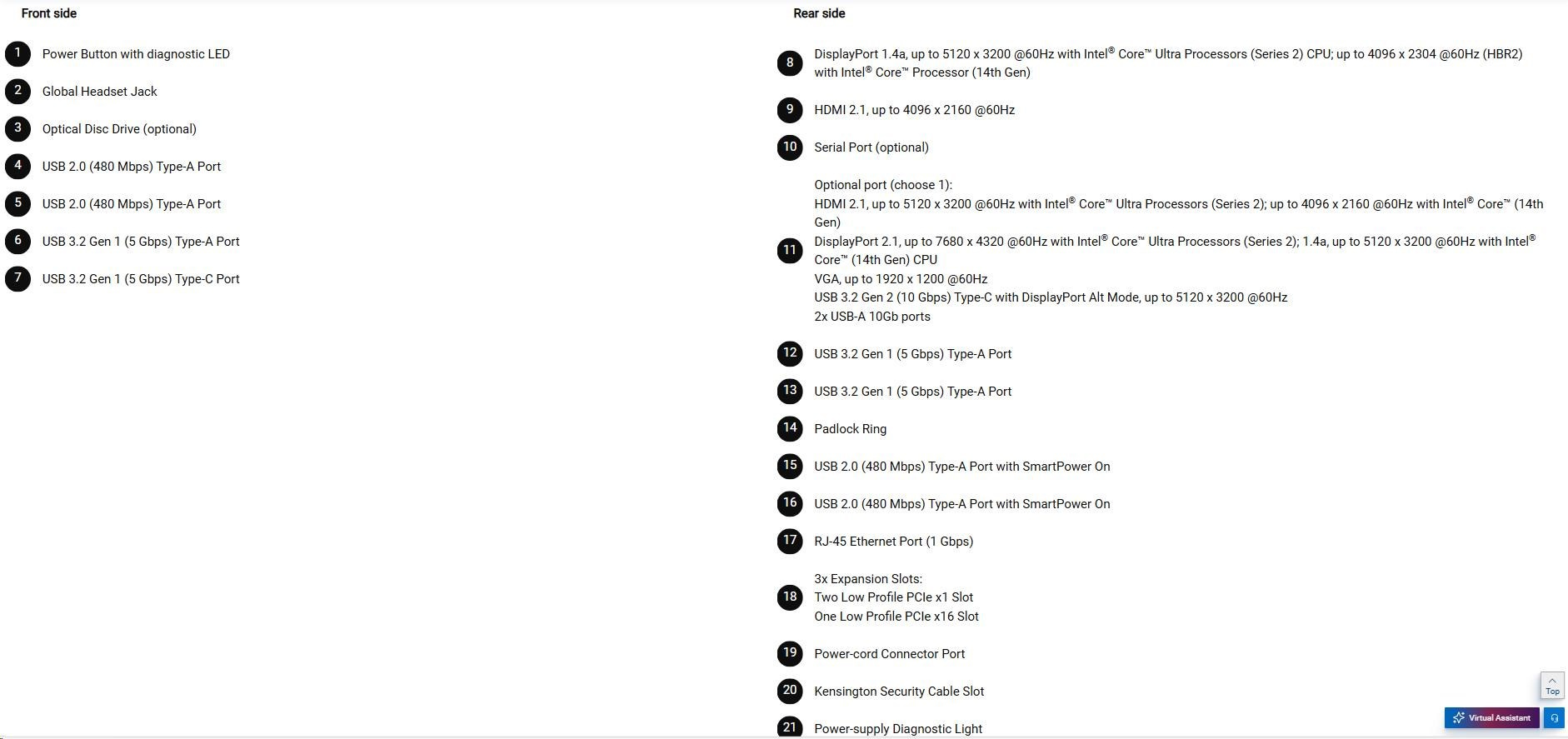 HDMI 2.1, up to 5120 x 3200 @60Hz with Intel® Core™ Ultra Processors (Series 2); up to 4096 x 2160 @60Hz with Intel® Core™ (14th Gen) DisplayPort 2.1, up to 7680 x 4320 @60Hz with Intel® Core™ UltraProcessors(Series 2); 1.4a, up to 5120 x 3200 @60Hz with Intel® Core™ (14th Gen) CPU VGA, up to 1920 x 1200 @60Hz USB 3.2 Gen 2 (10 Gbps) Type-C with DisplayPort Alt Mode, up to 5120 x 3200 @60Hz 2x USB-A 10Gb ports - USB 3.2 Gen 1 (5 Gbps) Type-A Port