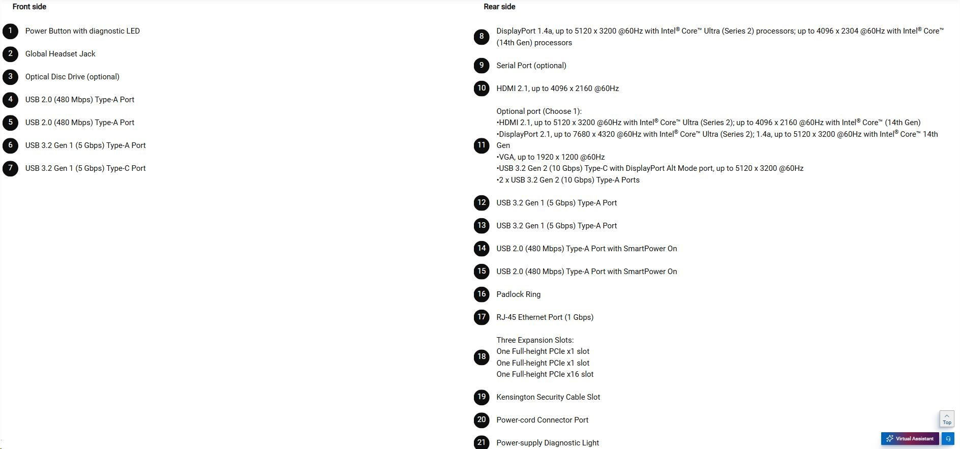 •HDMI 2.1, up to 5120 x 3200 @60Hz with Intel®Core™ Ultra (Series 2); up to 4096 x 2160 @60Hz with Intel®Core™ (14th Gen) •DisplayPort 2.1, up to 7680 x 4320 @60Hz with Intel®Core™ Ultra (Series 2); 1.4a, up to 5120 x 3200 @60Hz with Intel®Core™ 14th Gen •VGA, up to 1920 x 1200 @60Hz •USB 3.2 Gen 2 (10 Gbps) Type-C with DisplayPort Alt Mode port, up to 5120 x 3200 @60Hz •2 x USB 3.2 Gen 2 (10 Gbps) Type-A Ports - USB 3.2 Gen 1 (5 Gbps) Type-A Port