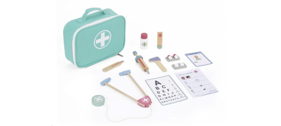 Doktorské vybavení v praktické brašně umožní dětem vyšetřovat pacienty v podobě plyšových hraček, panenek, kamarádů nebo rodičů, stanovit diagnózu a zahájit léčbu. Součástí dětského doktorského setu je základní lékařské vybavení včetně oční tabulky pro vyšetření zraku.