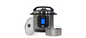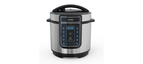 Tlakový hrnec o objemu 5 l, počet programů: 9, kuchařka v balení, možnost manuální úpravy, ovládání ventilu jednou rukou, počet ventilů: 1, příkonem 900 W, udržení teploty, displej, automatické vypnutí, regulace teploty a automatické programy.