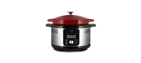 Multifunkční hrnec objem 6 l, litinový smaltovaný hrnec OvenSafe® vhodný na sporák či do trouby, vhodné do myčky, 10 programů, napařovač pro ohřev zeleniny, silikonové rukavice v balení, silikonová podložka v balení, regulace teploty, vyjímatelná nádoba a odložený start, časovač, udržení teploty, termostat, displej, automatické vypnutí.