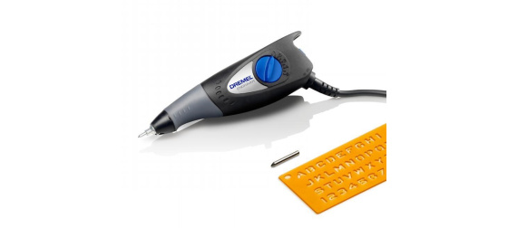 Gravírovací nástroj s variabilním řízením hloubky ke gravírování v materiálech, jako je kov, sklo, dřevo, plasty, keramika atd. Sada rovněž obsahuje šablonu ke snadnému gravírování písmen a číslic.