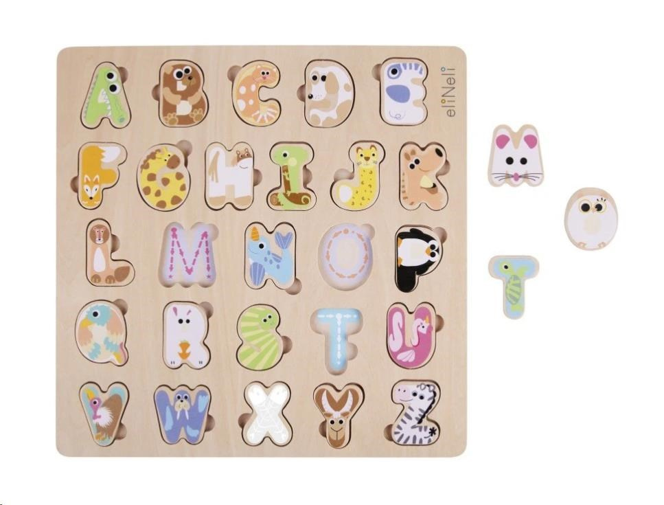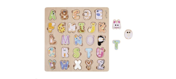 Dřevěná abeceda je krásnou hračkou i vzdělávací pomůckou, která by neměla chybět v žádném dětském pokojíčku. Abeceda 3v1 je originální vkládací puzzle se zvířátky, které potrénuje jemnou motoriku a koordinací očí a rukou, zároveň je učební pomůckou pro seznámení dětí s písmenky, abecedou, zvířátky a psaním velkých tiskacích písmen. Každé z písmenek abecedy představuje počáteční písmeno anglického názvu zvířátka a ukrývá pod sebou obrázek s názornou ukázkou, jak se dané písmenko píše. Pro snadné vyjmutí písmenek (zvířátek) z dřevěné desky, je u každého z písmen malý otvor, který tak akorát velký pro malé dětské prstíky.