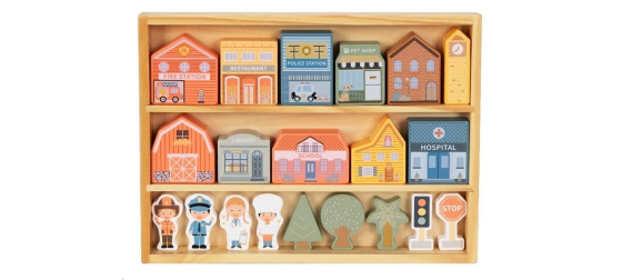 Dřevěné kostky patří mezi nejoblíbenější dřevěné hračky. S kostkami mohou děti popustit uzdu své fantazii, hrát si a stavět cesty, domečky i celá města. S dřevěnými kostkami město vybudují děti úžasné město s nemocnicí, policejní a hasičskou stanicí, se školou, knihovnou, obchůdky, obytnými domy a věčně zelenými stromy raz dva. Na dodržování pořádku dohlédne postavička policisty, o nemocné se postará pan doktor a pro případ požáru ve městě nechybí ani další hrdina - hasič. Dřevěné kostky krásné uložené v praktické krabičce si děti snadno přenesou na místo, kde si s nimi chtějí hrát, mohou si je vzít s sebou na návštěvu, na víkend k babičce i na dovolenou.