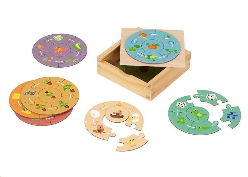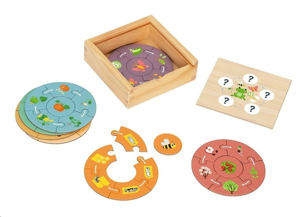 Dřevěné puzzle s originálním motivem cyklu života rostlin i zvířátek bude úžasnou hračkou pro děti od 3 let. Osm kruhových puzzle skládaček se šesti díly děti seznámí s podobou rostlin a zvířátek, od samého počátku až po jejich zralost a dospělost. Vše, co se děti při skládání naučí, spolu můžete později pozorovat venku, například při procházce, na zahradě nebo na prázdninách u babičky. Děti pochopí princip stárnutí a koloběh života nejen včelky, žabky, motýlka, ptáčka, slunečnice, jabloně, dýně a rajčete, ale začnou si všímat změn rostlin a zvířat ve svém okolí.