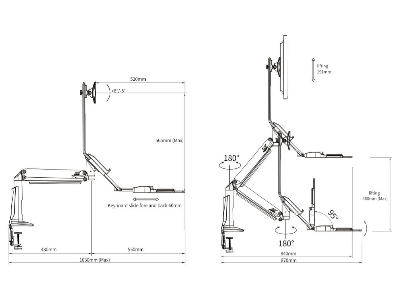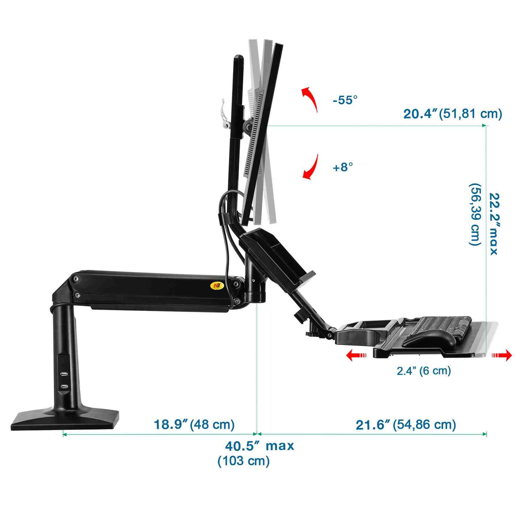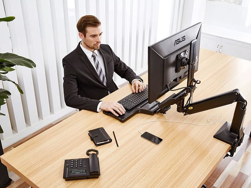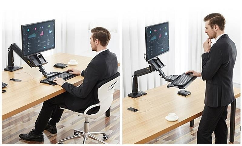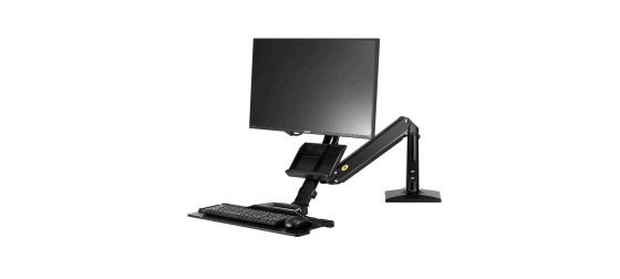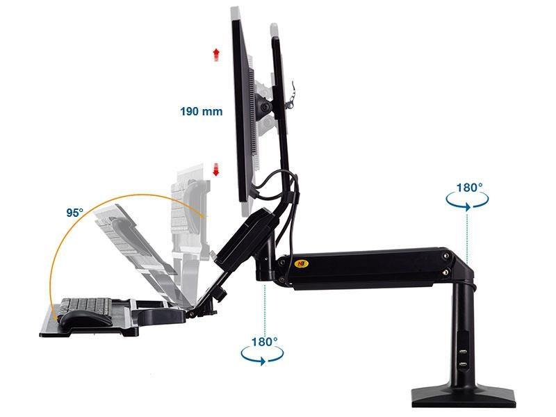 Držák monitoru a klávesnice NB NB35 Profesionální stolní držák na monitor 17-30" s poličkou na klávesnici 560x200mm, výškové polohování +/-480mm, naklápění +12°/-15°, otáčení +/-180°, pivot, možnost vysunutí a zaklopení police, přihrádka, 2x USB 3.0 porty, práce v sedě i vestoje, VESA 75x75 a 100x100, nosnost 9kg Univerzální stolní držák na monitor 17-30" a klávesnici pro ergonomické kanceláře, který Vám umožní kdykoliv změnit pozici pro práci jak vsedě tak i vestoje. Změna pozice je velmi snadná a rychlá, bez použití jakéhokoliv nářadí nebo složitého přenastavování - během okamžiku změníte výšku až o 480mm. Na držák je možné uchytit všechny typy monitorů s VESA standardem 75x75 nebo 100x100. Držák umožňuje snadné kompletní nastavení dle potřeby - otáčení do stran, výšková polohovatelnost, náklon obrazovky, posun a náklon police, vzdálenost od stolního uchycení, korekce roviny. Kvalitní duální úchyt pro zajištění na okraji stolu a perfektní fixaci. Profesionální kvalita, vynikající zpracování, krásný design a velmi snadné nastavení. Barevné provedení černé. Profesionální polohovatelný držák monitoru a klávesnice pro práci jak vsedě tak i vestoje NB NB35 Technické údaje: maximální zatížení 9kg minimální zatížení 2kg podporuje VESA standardy 75x75 a 100x100 možnost rozšíření VESA standardu na 200x100 nebo 200x200 ideální na monitory a televizory s úhlopříčkou 17-30" otáčení do stran +/- 180° náklon monitoru -12° / +15° funkce pivot - možnost polohy monitoru na šířku nebo na výšku maximální výška 950mm od stolové desky maximální délka od uchycení 1020mm celkové výškové nastavení +/- 480mm úprava výšky samotného monitoru na držáku 100mm police na klávesnici s rozměry 560x200mm možnost vysunutí police +/- 60mm, naklopení +/- 12°, možnost úplného zaklopení uchycení na okraj stolu, duální úchyt, na desky o síle 20-90mm 2x USB 3.0 port barevné provedení černé profesionální kvalita, snadná polohovatelnost záruka 3 roky Pracovní stanice - polohovatelný držák na monitor a klávesnici pro volbu, zda chcete pracovat vsedě nebo vestoje NB NB35Polohovatelný držák na monitor i klávesnici, výškové nastavení pro možnost práce vsedě nebo vestoje, snadné a rychlé polohování - Fiber Mounts NB35 Držák podporuje VESA standardy: VESA 75x75 VESA 100x100 Držák je vhodný pro uchycení všech typů monitorů a televizorů s úhlopříčkou 17-30", které podporují některý z výše uvedených VESA standardů a jejichž hmotnost je v rozmezí 2-9kg..