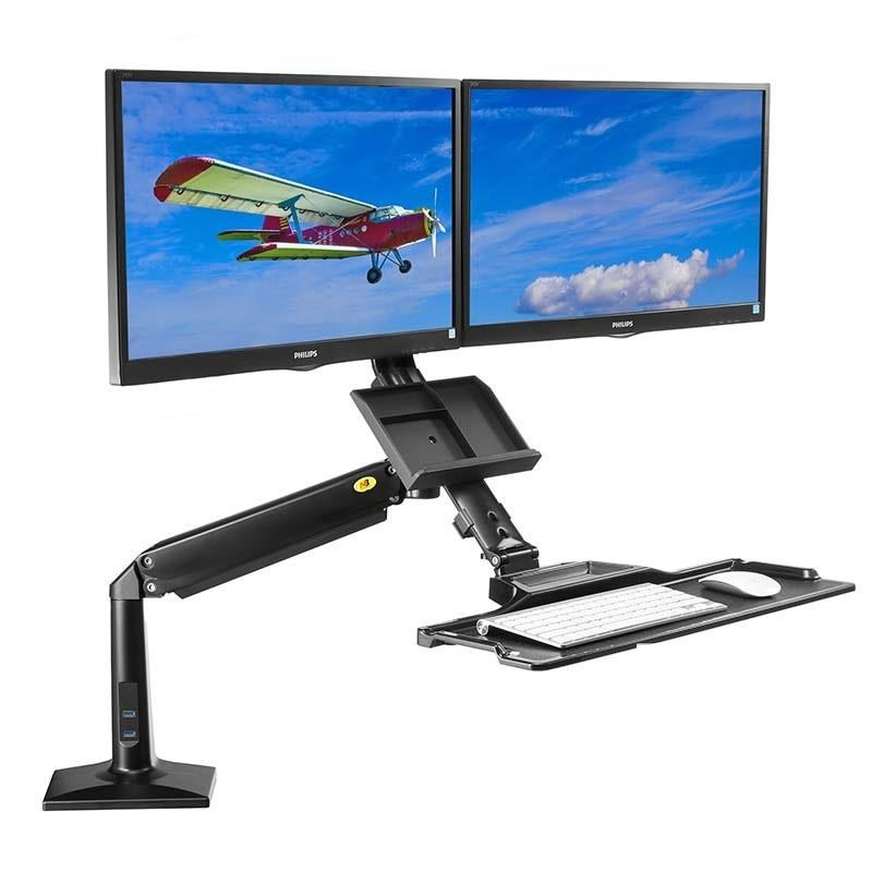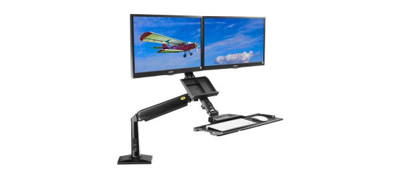 Stolní držák na 2 monitory a klávesnici NB FC24-2A-B Profesionální pracovní stanice pro dva monitory 17-27" s policí na klávesnici a myš, ergonomický držák pro rychlou změnu pro práci vsedě nebo vestoje, plná polohovatelnost, VESA 75x75 a 100x100, plynová pružina, nosnost 15kg Profesionální stolní držák na 2 monitory 17-27" s policí na klávesnici a myš, ergonomický pro práci ve stoje nebo vsedě se snadným a rychlým výškovým polohováním 480mm. Monitory lze na držáku posouvat do stran, naklápět, otočit na šířku nebo na výšku, mírně natáčet do stran, výškově polohovat. Extrémně snadné výškové polohování celého držáku díky plynové pružině, během okamžiku můžete změnit pozici vsedě na pozici vestoje a otočit držák do stran +/- 180°. Profesionální kvalita s důrazem na dizajn, 2x USB porty 3.0, systém pro vedení kabeláže, snadná instalace na stolové desky o průměru 10-95mm. Barevné provedení černé, záruka 3 roky. Pracovní stanice na 2 monitory 17-27" s policí na klávesnici a myš, ergonomický pro práci vsedě nebo vestoje NB FC24-2A Technické údaje: nosnost minimální 9kg / maximální 15 kg VESA standard 75x75 a 100x100 na monitory a displeje s úhlopříčkou 17-27" naklápění monitorů +16° / -10° nastavení výšky monitoruod police +/- 191 mm výškové polohování celého držáku +/- 480 mm maximální výška od pracovní desky 1011 mm otáčení do stran +/- 180° funkce PIVOT - otočení monitorů na šířku nebo na výšku úprava vzdálenosti police 0 ~ 60 mm rozměry police na klávesnici 560x200 mm organizátor pod obrazovkou o rozměrech 220x160 mm dva porty USB 3.0 systém vedení kabeláže ergonomický držák pro rychlé nastavení pro práci vsedě nebo vestoje uchycení na okraj stolu, stolové desky o síle 10-95mm profesionální kvalita a zpracovnání jednoduchá montáž a velmi snadné polohování barevné provedení černé záruka 3 roky Držák NB FC24-2A-B podporuje VESA standardy: VESA 75x75 VESA 100x100.